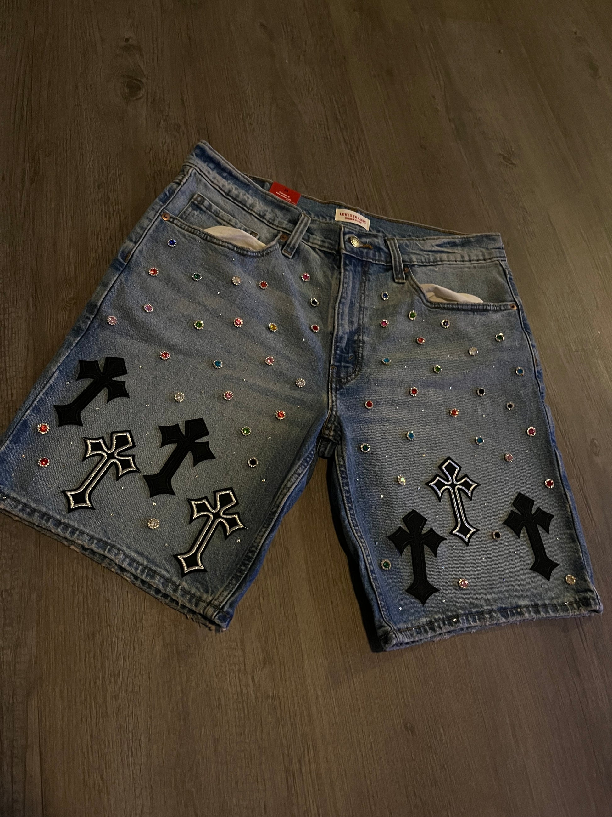 Step up your style game with these vibrant shorts! Featuring a unique pattern of crosses & rhinestones